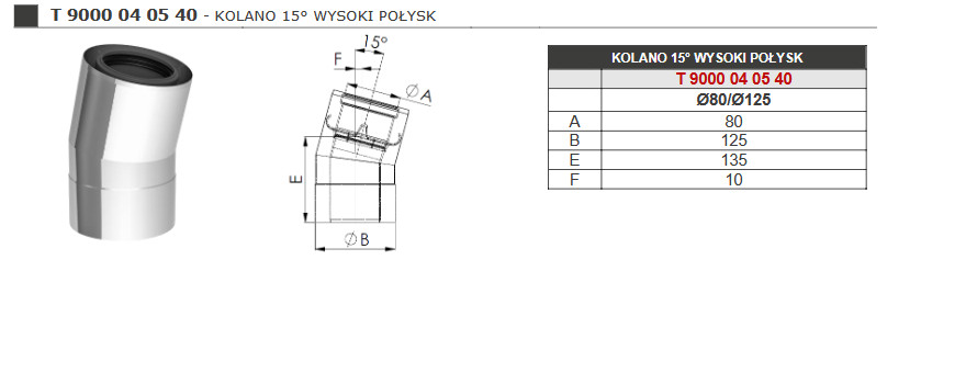 TERMET KOLANO 15° PP/STAL WYSOKI POŁYSK Ø80/Ø125 MM T 9000 04 05 40