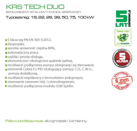 Kotły typu KRS TECH DUO z palnikiem retortowym, przeznaczone są do wodnych instalacji centralnego ogrzewania systemu otwartego, z grawitacyjnym jak i wymuszonym obiegiem wody. Kotły stanowią konstrukcję stalową spawaną, z blach gwarantujących długotrwałe użytkowanie, odpornych na działające na nie w czasie eksploatacji czynniki, gdzie realizowana jest wysoko efektywna technika spalania jednostkowej dawki paliwa w ściśle określonych warunkach. Są wyposażone w specjalnie skonstruowany palnik wykonany z żeliwa, do którego podawane jest paliwo z zasobnika za pomocą podajnika ślimakowego.
