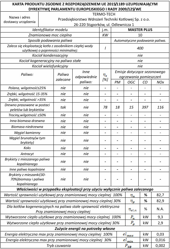 Bezproblemowa eksploatacja kotła MASTER PLUS zależy od zastosowania odpowiedniego paliwa. Podstawowym paliwem jest granulat z trocin pellet – klasa C1 zgodnie z normą PN-EN 303-5 o następujących parametrach: