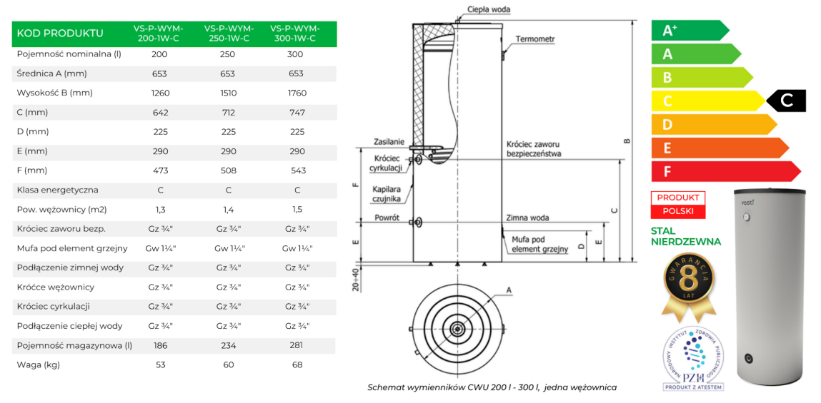 100 l, 120 l, 150 l, 200 l, 250 l oraz 300 l oraz dwóch klasach energetycznych B (zbiorniki CWU 100 l – 150 l) i klasie energetycznej C (zbiorniki CWU 200 l – 1000 l).