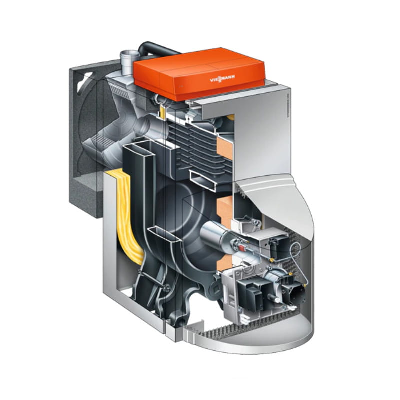 Konstrukcja olejowego kotła kondensacyjnego Vitorondens 200-T opiera się na wypróbowanym od wielu lat żeliwnym kotle Vitorond 100. Dzięki połączeniu powierzchni grzewczej z wymiennikiem ciepła spalanie i kondensacja przebiegają oddzielnie. Dzięki temu pozostałości produktów spalania pozostają w komorze spalania, a w wymienniku ciepła gazy spalinowe skraplają się, nie pozostawiając osadów.