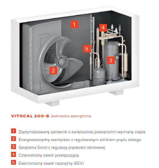 - Pompa ciepła powietrze–woda Vitocal 200-S typu Split, o maksymalnej mocy grzewczej 5,7 do 14,7 kW (przy A7/W35)