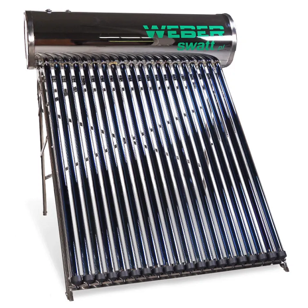 Wysokiej jakości kolektor słoneczny ciśnieniowy rurowo-próżniowy Weber Sol Compact + stelaż i zbiornik ze stali nierdzewnej o pojemności 200 litrów. Kolektor słoneczny ciśnieniowy pochłaniając promienie słoneczne przy pomocy rur próżniowych, przekazuje energię cieplną do wody zgromadzonej w nierdzewnym zbiorniku.