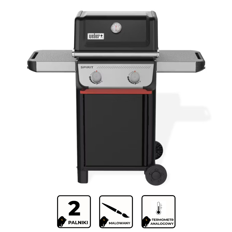 Grilluj jeszcze smaczniejsze potrawy na zaprojektowanym od nowa 2-palnikowym grillu gazowym Spirit® E-210. Zapalaj palniki jedną ręką, używając zapłonu Snap-Jet i precyzyjnie kontroluj temperaturę w pełnym zakresie. Maksymalnie wykorzystaj miejsce, dodając do szyn bocznych różne zatrzaskowe akcesoria Weber Works (sprzedawane oddzielnie). Dzięki odpornym na zarysowania i łatwym w czyszczeniu stolikom bocznym z młotkowanej stali, talerze, przyprawy i narzędzia będą zawsze pod ręką.